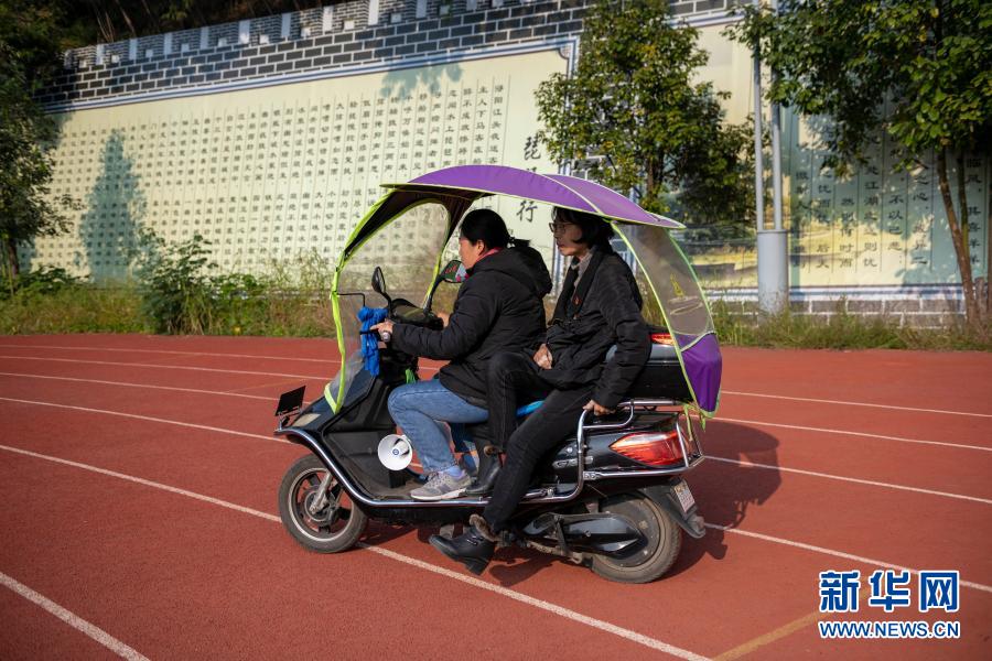 因?yàn)橥饶_不便,張桂梅(后)坐車從田徑場(chǎng)回教學(xué)樓(11月30日攝)。新華社發(fā)(陳欣波 攝)