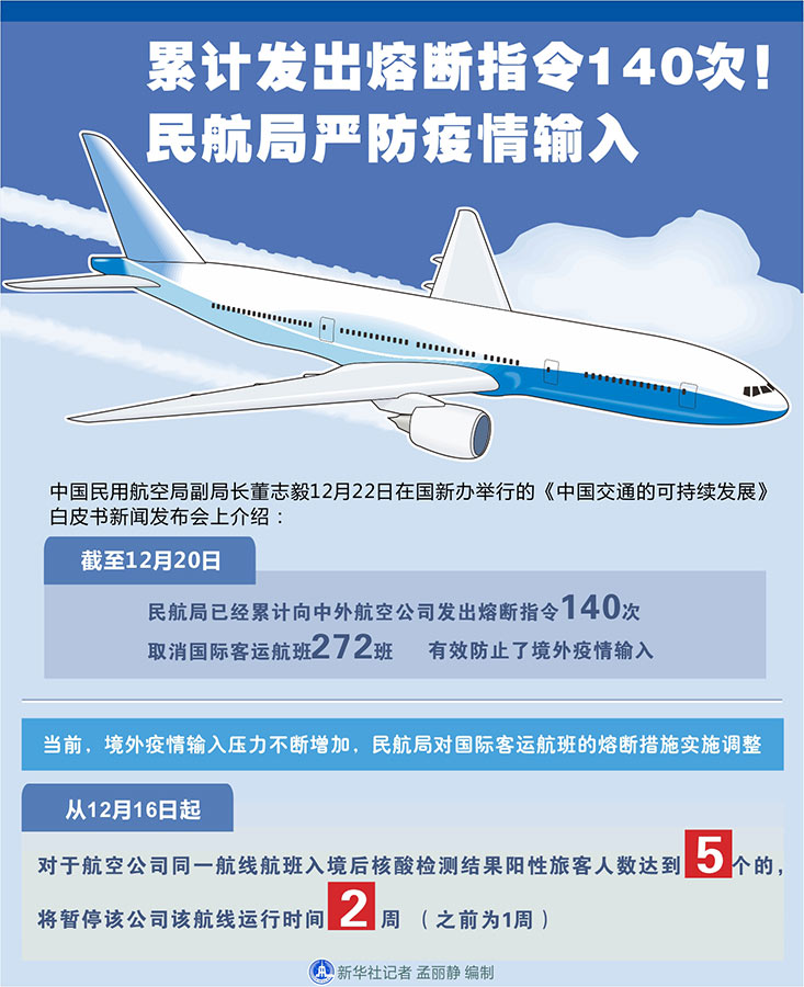 新華社北京12月22日電(記者周圓、魏玉坤)中國(guó)民用航空局副局長(zhǎng)董志毅22日在國(guó)新辦舉行的《中國(guó)交通的可持續(xù)發(fā)展》白皮書新聞發(fā)布會(huì)上介紹,截至12月20日,民航局已經(jīng)累計(jì)向中外航空公司發(fā)出熔斷指令140次,取消國(guó)際客運(yùn)航班272班,有效防止了境外疫情輸入。