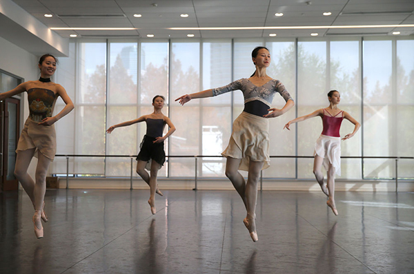 12月15日,項陽(右二)和同伴在上海芭蕾舞團排練廳里排練。