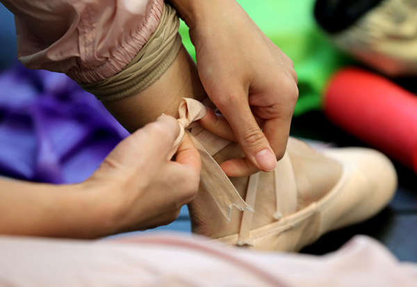 12月15日,項陽在基礎訓練課前綁足尖鞋。