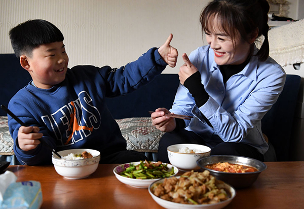 12月18日,黃菲8歲的兒子宋晗昱和媽媽一起吃午飯,并為媽媽做的飯菜點(diǎn)贊。