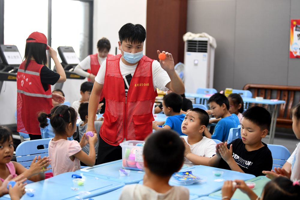 ??7月29日,在合肥市一六八中學(xué)安置點(diǎn),志愿者帶小朋友做游戲。