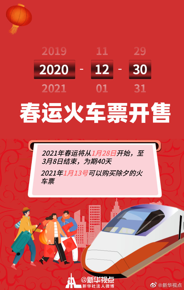 12月30日,2021年春運火車票正式開始發(fā)售。2021年春運將從1月28日開始,至3月8日結(jié)束,為期40天。不知道你做好出行計劃了嗎?說到買票,讓小編為你敲重點:1月13日前后可以購買除夕前后的火車票;想安安靜靜旅行,你可以選擇靜音車廂;票沒搶到,你可以通過“候補購票”功能試試運氣??紤]疫情原因,建議有條件的旅客錯峰出行,避開春運高峰期,出行時做好防護(hù)措施,全程佩戴口罩。(記者 樊曦 周圓)