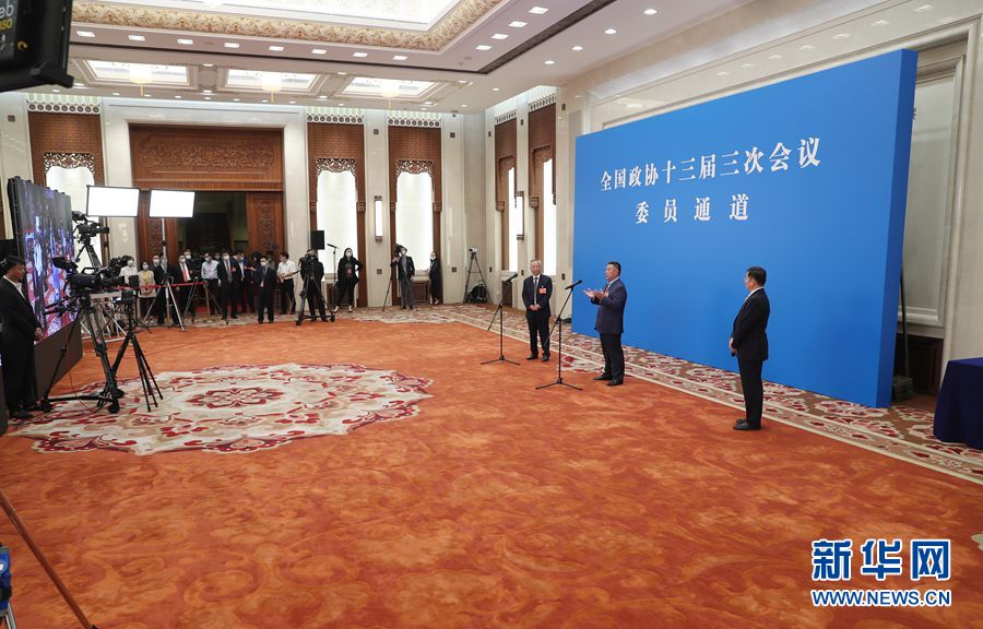 全國(guó)政協(xié)十三屆三次會(huì)議首場(chǎng)“委員通道”采訪活動(dòng)于5月21日在人民大會(huì)堂新聞發(fā)布廳舉行,邀請(qǐng)部分全國(guó)政協(xié)委員通過網(wǎng)絡(luò)視頻方式接受媒體采訪。圖為“委員通道”現(xiàn)場(chǎng)。新華網(wǎng) 王翰林 攝