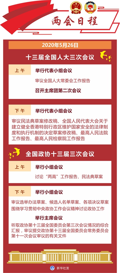 新華社北京5月25日電? 十三屆全國人大三次會議26日上午舉行代表小組會議,審議全國人大常委會工作報告;11時召開主席團第二次會議。下午舉行代表小組會議,審議民法典草案修改稿、全國人民代表大會關(guān)于建立健全香港特別行政區(qū)維護國家安全的法律制度和執(zhí)行機制的決定草案修改稿、最高人民法院工作報告、最高人民檢察院工作報告。