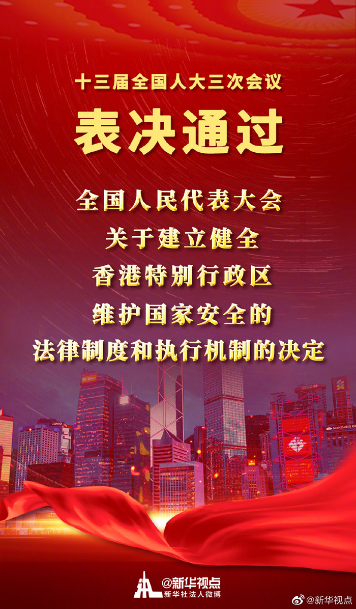 十三屆全國人大三次會(huì)議表決通過了全國人民代表大會(huì)關(guān)于建立健全香港特別行政區(qū)維護(hù)國家安全的法律制度和執(zhí)行機(jī)制的決定-新華網(wǎng)