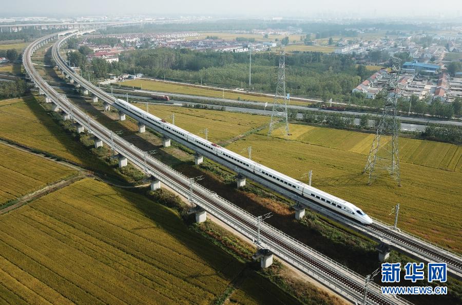 2020年10月10日,一列動(dòng)車組列車行駛在江蘇連云港市境內(nèi)(無人機(jī)照片)。