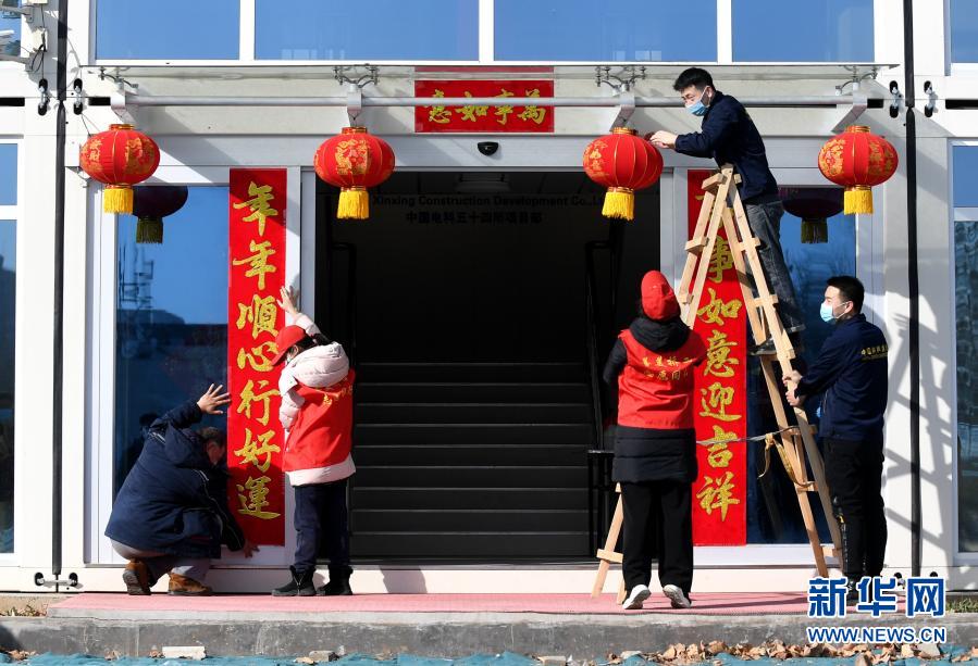 2月6日,在河北省石家莊市橋西區(qū)一處工地項(xiàng)目部,志愿者與工人們一起掛燈籠。新華社記者 王曉 攝