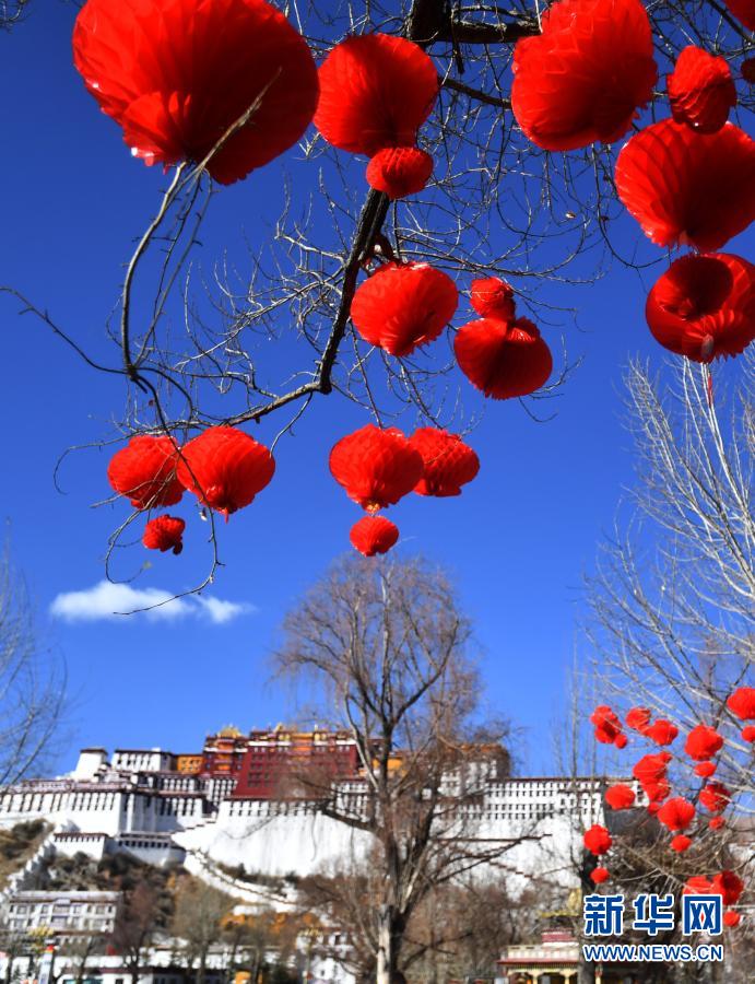 2月8日拍攝的拉薩布達(dá)拉宮前的紅燈籠。新華社記者 覺果 攝