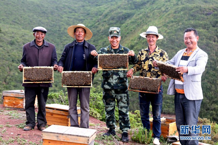 武警四川總隊涼山支隊精準(zhǔn)幫扶昭覺縣梭梭拉打村發(fā)展養(yǎng)蜂產(chǎn)業(yè),總隊駐村扶貧干部布哈(中)和村民一同展示豐收成果(2019年6月12日攝)。新華社發(fā)(楊劍 攝)