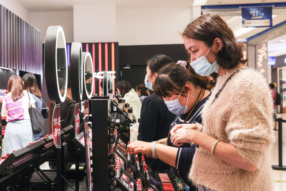 消費(fèi)者在海口日月廣場(chǎng)免稅店購(gòu)物。(新華社記者張麗蕓2021年3月25日攝)