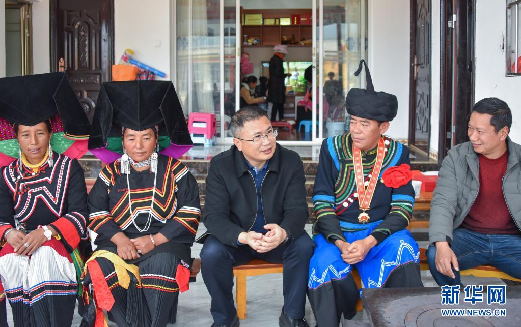 聶金輝(中)在老君山鎮(zhèn)新和村易地扶貧搬遷安置點(diǎn)索瑪小鎮(zhèn)看望慰問彝族群眾(3月3日攝)。新華社發(fā)(劍川縣融媒體中心供圖)