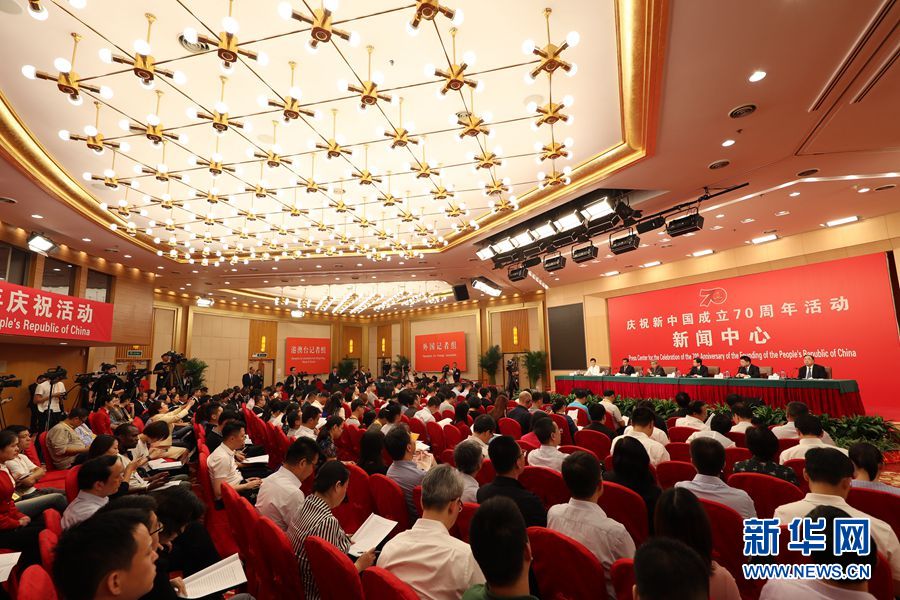 9月26日,慶祝中華人民共和國成立70周年活動新聞中心在北京梅地亞中心二層新聞發(fā)布廳舉辦第二場新聞發(fā)布會。圖為新聞發(fā)布會現(xiàn)場。新華網(wǎng)記者 郭小天 攝