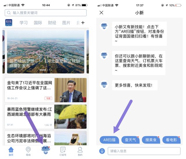 ↑進(jìn)入新華社客戶端首頁(yè),點(diǎn)擊“小新機(jī)器人”后,選擇AR掃描功能(AR掃描功能不會(huì)保留任何用戶信息)。將新華社客戶端升級(jí)到最新版本可以獲得更好的體驗(yàn)。