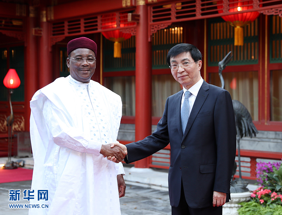 8月31日,中共中央政治局常委、中央書記處書記王滬寧在北京釣魚臺(tái)國賓館會(huì)見尼日爾總統(tǒng)伊素福。 新華社記者丁海濤攝