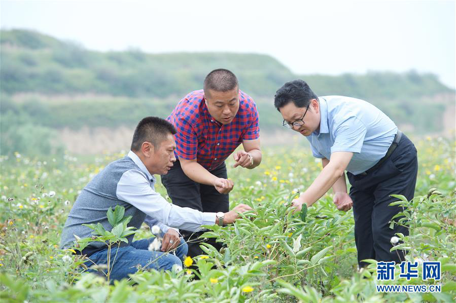 來自福建長樂的林錦云(中)在寧夏固原市河川鄉(xiāng)與福建對口支援農(nóng)業(yè)專家(右)交流牡丹種植技術(shù)(8月28日攝)。2014年,林錦云通過土地流轉(zhuǎn)方式,承包了河川鄉(xiāng)1.5萬畝荒山,打造油用牡丹生產(chǎn)基地。目前,林錦云種下的7600畝油用牡丹已經(jīng)開始產(chǎn)生效益,公司已就近吸納村民300多人就業(yè),其中建檔立卡貧困戶39戶,人均年收入2萬多元。? 新華社記者姜克紅攝