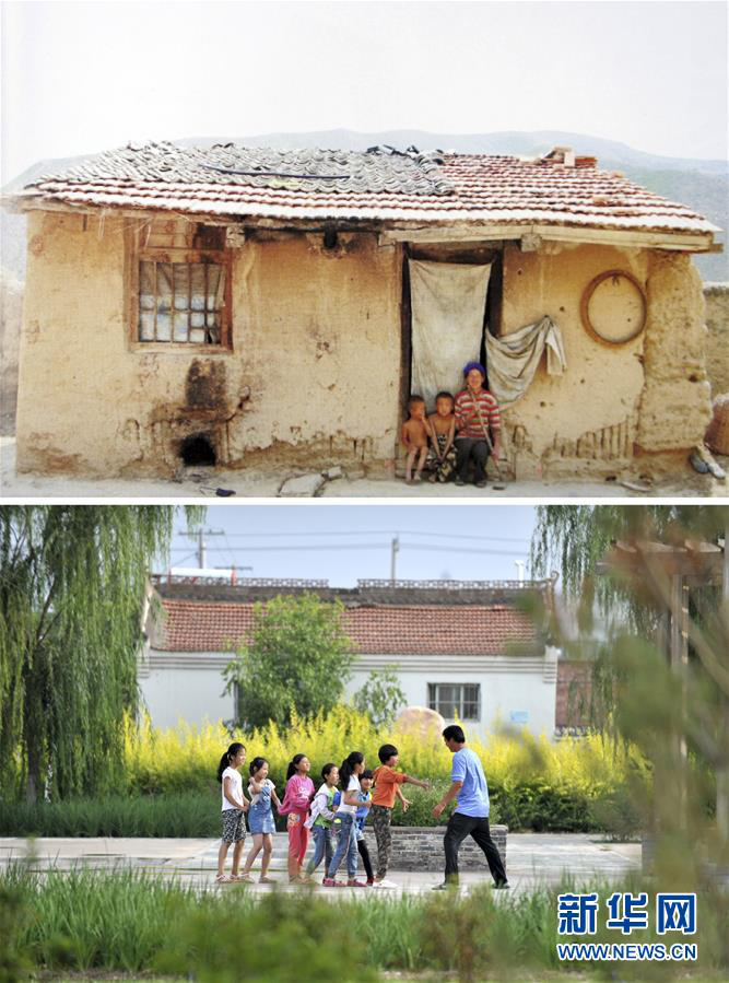 拼版照片:上圖為寧夏銀川市永寧縣閩寧鎮(zhèn)建設(shè)初期簡易的土坯房(資料照片);下圖為8月17日,孩子們在閩寧鎮(zhèn)原隆村一休閑廣場上玩耍(新華社記者劉軍喜攝)。? 新華社發(fā)