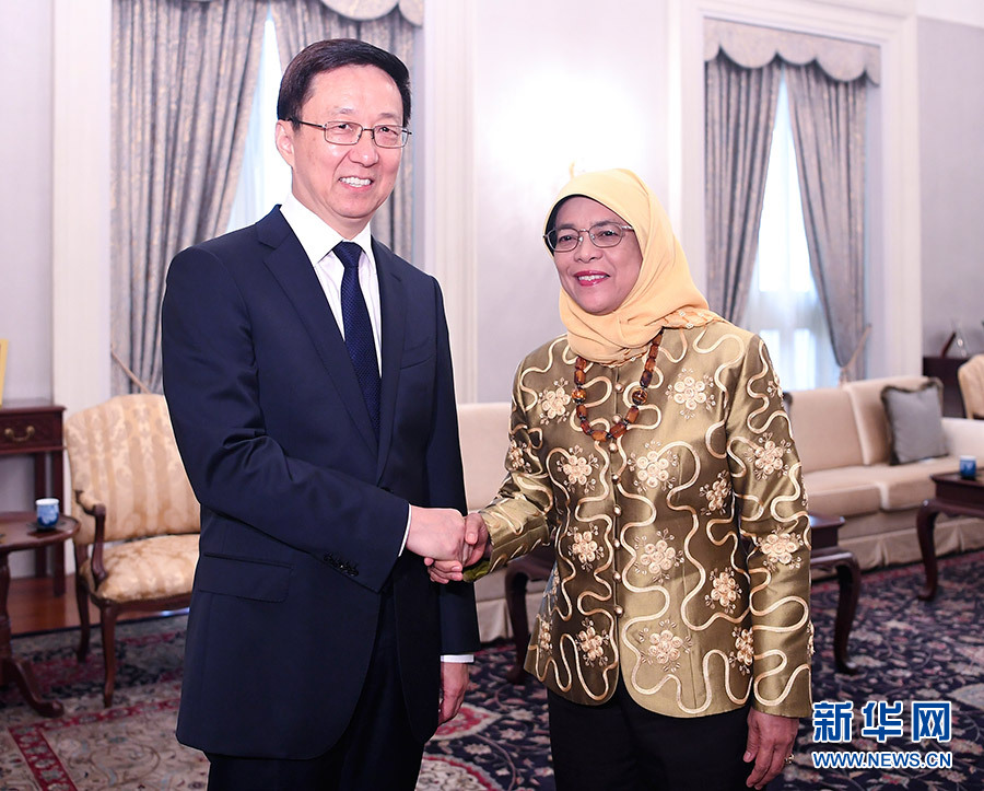 9月19日至21日,中共中央政治局常委、國務(wù)院副總理韓正應(yīng)邀訪問新加坡,分別會見新加坡總統(tǒng)哈莉瑪、總理李顯龍、副總理張志賢、副總理尚達(dá)曼,并同張志賢共同主持中新雙邊合作聯(lián)委會第十四次會議、蘇州工業(yè)園區(qū)聯(lián)合協(xié)調(diào)理事會第十九次會議、天津生態(tài)城聯(lián)合協(xié)調(diào)理事會第十次會議和中新(重慶)戰(zhàn)略性互聯(lián)互通示范項(xiàng)目聯(lián)合協(xié)調(diào)理事會第二次會議。這是9月21日,韓正會見新加坡總統(tǒng)哈莉瑪。 新華社記者 燕雁 攝