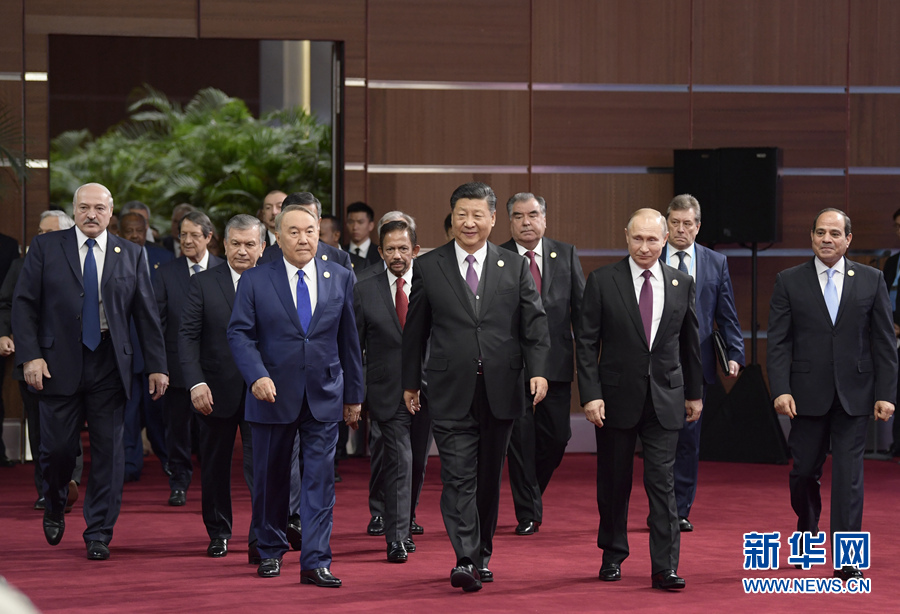 4月26日,國(guó)家主席習(xí)近平在北京出席第二屆“一帶一路”國(guó)際合作高峰論壇開(kāi)幕式,并發(fā)表題為《齊心開(kāi)創(chuàng)共建“一帶一路”美好未來(lái)》的主旨演講。這是習(xí)近平和出席開(kāi)幕式的外方領(lǐng)導(dǎo)人共同步入會(huì)場(chǎng)。 新華社記者李學(xué)仁攝