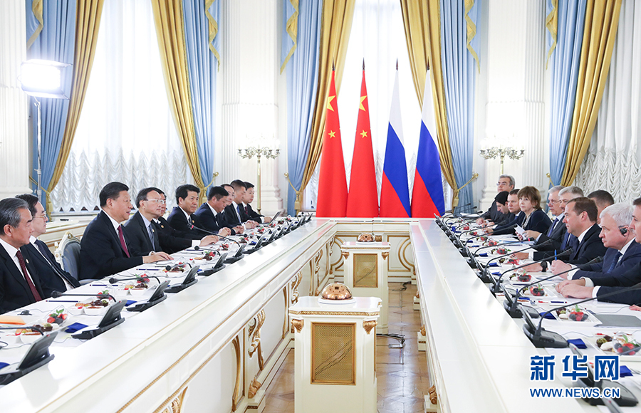 6月6日,國家主席習(xí)近平在莫斯科會見俄羅斯總理梅德韋杰夫。 新華社記者 姚大偉 攝