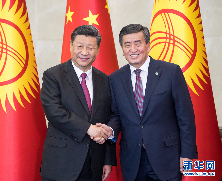 6月13日,國家主席習近平在比什凱克同吉爾吉斯斯坦總統(tǒng)熱恩別科夫會談。這是會談結束后,兩國元首共同會見記者。 新華社記者 殷博古 攝