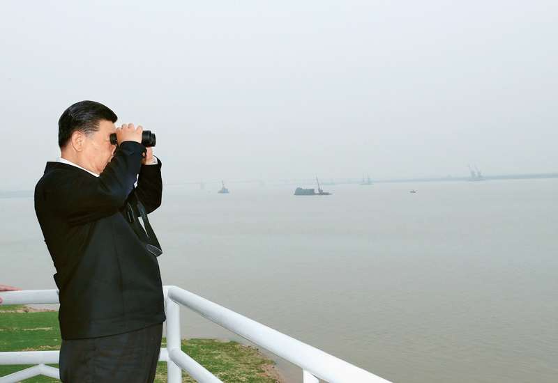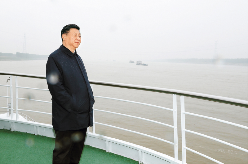 2018年4月26日下午,中共中央總書記、國家主席、中央軍委主席習(xí)近平在武漢主持召開深入推動(dòng)長江經(jīng)濟(jì)帶發(fā)展座談會(huì)并發(fā)表重要講話。這是座談會(huì)前,習(xí)近平于25日上午乘船沿江察看兩岸生態(tài)環(huán)境和發(fā)展建設(shè)情況。 新華社記者 謝環(huán)馳/攝