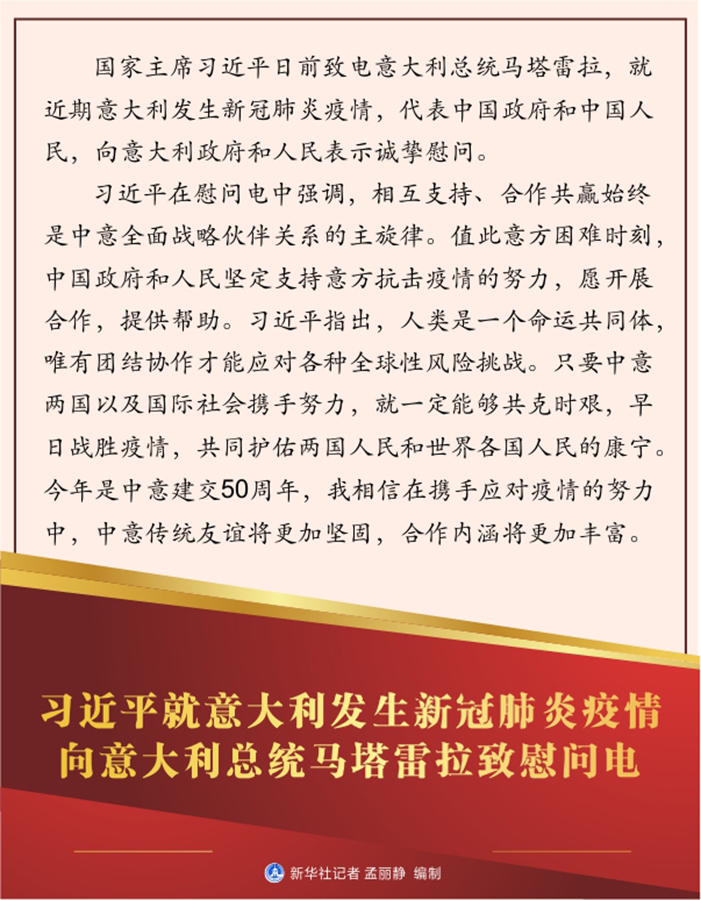 習(xí)近平在慰問電中強(qiáng)調(diào),相互支持、合作共贏始終是中意全面戰(zhàn)略伙伴關(guān)系的主旋律。值此意方困難時(shí)刻,中國(guó)政府和人民堅(jiān)定支持意方抗擊疫情的努力,愿開展合作,提供幫助。習(xí)近平指出,人類是一個(gè)命運(yùn)共同體,唯有團(tuán)結(jié)協(xié)作才能應(yīng)對(duì)各種全球性風(fēng)險(xiǎn)挑戰(zhàn)。只要中意兩國(guó)以及國(guó)際社會(huì)攜手努力,就一定能夠共克時(shí)艱,早日戰(zhàn)勝疫情,共同護(hù)佑兩國(guó)人民和世界各國(guó)人民的康寧。今年是中意建交50周年,我相信在攜手應(yīng)對(duì)疫情的努力中,中意傳統(tǒng)友誼將更加堅(jiān)固,合作內(nèi)涵將更加豐富。