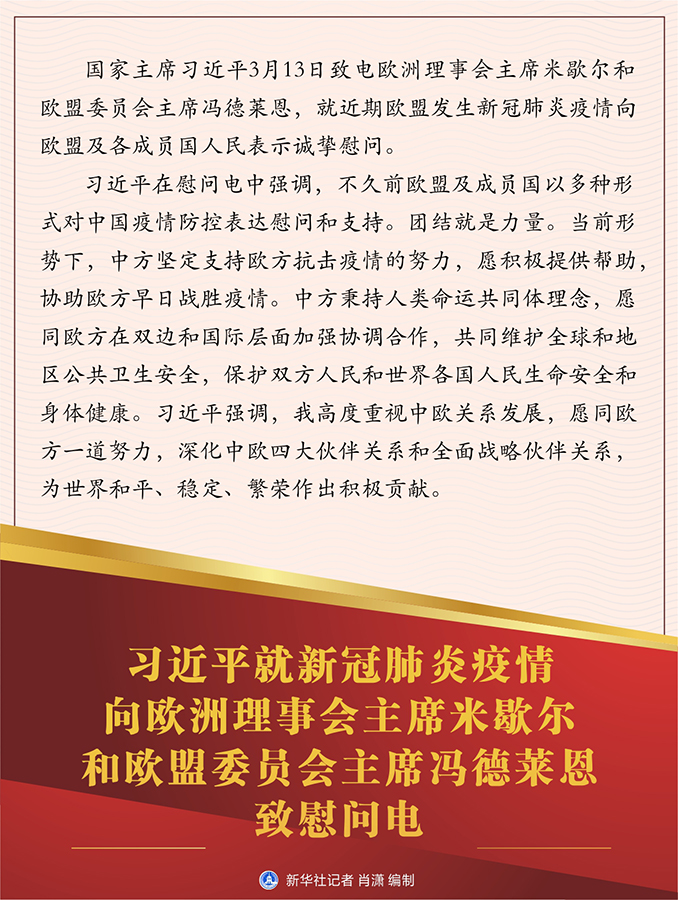 新華社北京3月14日電? 國家主席習近平3月13日致電歐洲理事會主席米歇爾和歐盟委員會主席馮德萊恩,就近期歐盟發(fā)生新冠肺炎疫情向歐盟及各成員國人民表示誠摯慰問。