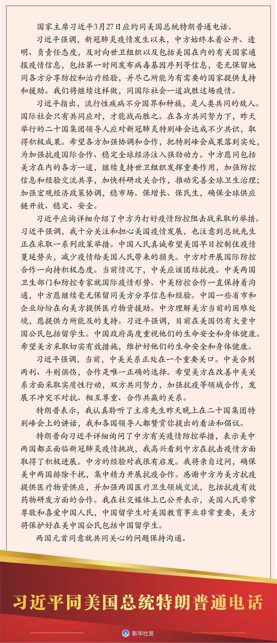 特朗普向習近平詳細詢問了中方有關疫情防控舉措,表示美中兩國都正面臨新冠肺炎疫情挑戰(zhàn),我高興看到中方在抗擊疫情方面取得了積極進展。中方的經驗對我很有啟發(fā)。我將親自過問,確保美中兩國排除干擾,集中精力開展抗疫合作。感謝中方為美方抗疫提供醫(yī)療物資供應,并加強兩國醫(yī)療衛(wèi)生領域交流,包括抗疫有效藥物研發(fā)方面的合作。我在社交媒體上已公開表示,美國人民非常尊敬和喜愛中國人民,中國留學生對美國教育事業(yè)非常重要,美方將保護好在美中國公民包括中國留學生。