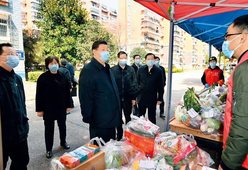 2020年3月10日,中共中央總書記、國家主席、中央軍委主席習(xí)近平專門赴湖北省武漢市考察新冠肺炎疫情防控工作。這是習(xí)近平在東湖新城社區(qū)生活物資集中配送點,詳細(xì)詢問社區(qū)群眾生活物資采購和供應(yīng)情況。 新華社記者 謝環(huán)馳/攝