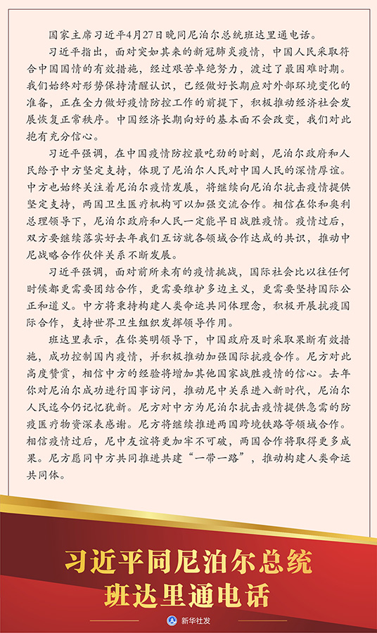 習(xí)近平強(qiáng)調(diào),在中國疫情防控最吃勁的時刻,尼泊爾政府和人民給予中方堅(jiān)定支持,體現(xiàn)了尼泊爾人民對中國人民的深情厚誼。中方也始終關(guān)注著尼泊爾疫情發(fā)展,將繼續(xù)向尼泊爾抗擊疫情提供堅(jiān)定支持,兩國衛(wèi)生醫(yī)療機(jī)構(gòu)可以加強(qiáng)交流合作。相信在你和奧利總理領(lǐng)導(dǎo)下,尼泊爾政府和人民一定能早日戰(zhàn)勝疫情。疫情過后,雙方要繼續(xù)落實(shí)好去年我們互訪就各領(lǐng)域合作達(dá)成的共識,推動中尼戰(zhàn)略合作伙伴關(guān)系不斷發(fā)展。