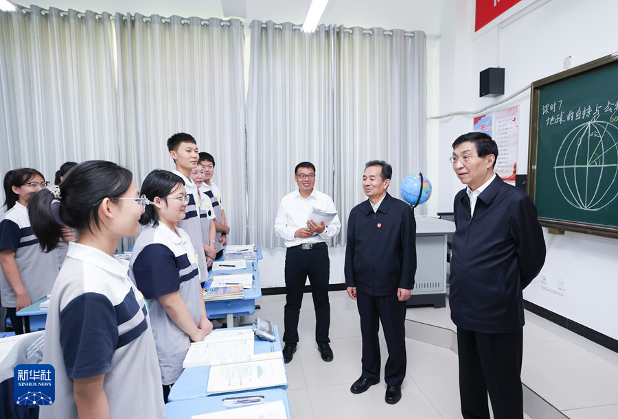 9月25日下午,受习近平总书记嘱托,中共中央政治局常委、全国政协主席、中央代表团团长王沪宁带领中央代表团部分成员在巴音郭楞蒙古自治州库尔勒市看望慰问当地各族干部群众。这是王沪宁和中央代表团部分成员在库尔勒市第二十三中学考察教育援疆情况。新华社记者 姚大伟 摄