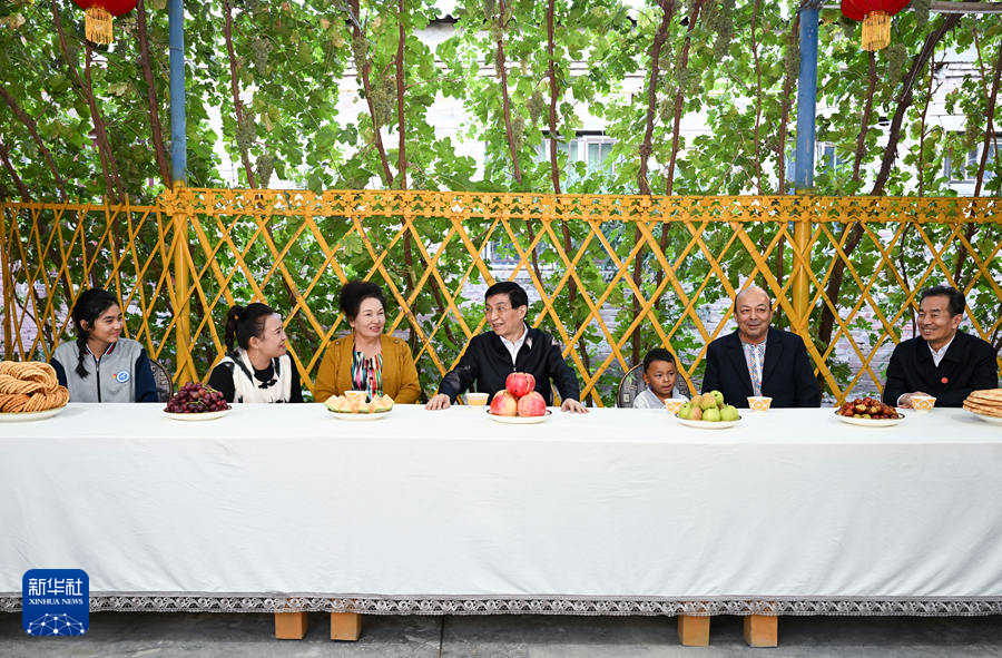9月25日下午,受习近平总书记嘱托,中共中央政治局常委、全国政协主席、中央代表团团长王沪宁带领中央代表团部分成员在巴音郭楞蒙古自治州库尔勒市看望慰问当地各族干部群众。这是王沪宁和中央代表团部分成员在库尔勒市阿瓦提乡吾夏克铁热克村了解乡村产业发展和群众生产生活情况。新华社记者 张领 摄