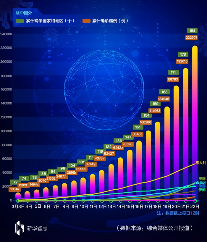 根據(jù)世界衛(wèi)生組織22日公布的最新數(shù)據(jù),中國以外新冠肺炎確診病例20多萬。目前,歐洲已成為疫情“震中”,美國宣布進入“國家緊急狀態(tài)”,中東多國“封城”,拉美、非洲多國報告確診病例……隨著新冠肺炎全球確診病例持續(xù)快速增加,網(wǎng)友對全球疫情進展情況的關(guān)注度迅速升溫。