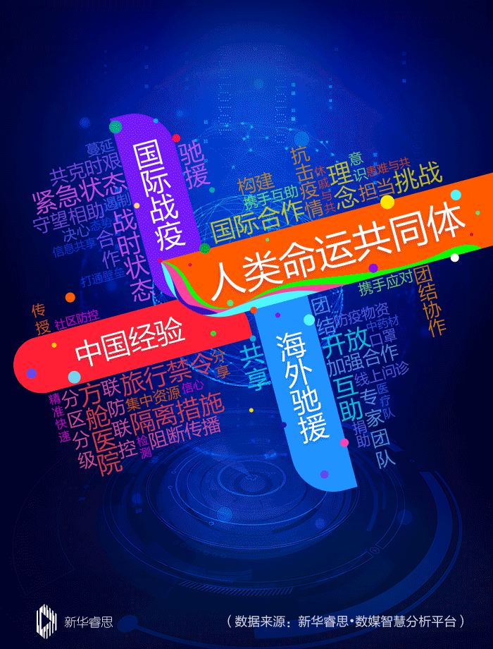 新華睿思持續(xù)跟蹤微博、抖音、今日頭條等網(wǎng)上熱搜榜高熱話題,以及重大新聞事件,梳理出網(wǎng)友關(guān)注的熱詞集錦。根據(jù)關(guān)注度排行可以看出,“人類命運共同體”“國際戰(zhàn)疫”“中國經(jīng)驗”“海外馳援”四個關(guān)鍵詞位居前列。同時,“國際合作”“戰(zhàn)時狀態(tài)”“方艙醫(yī)院”“共享”“開放”“互助”等成為熱搜詞匯。