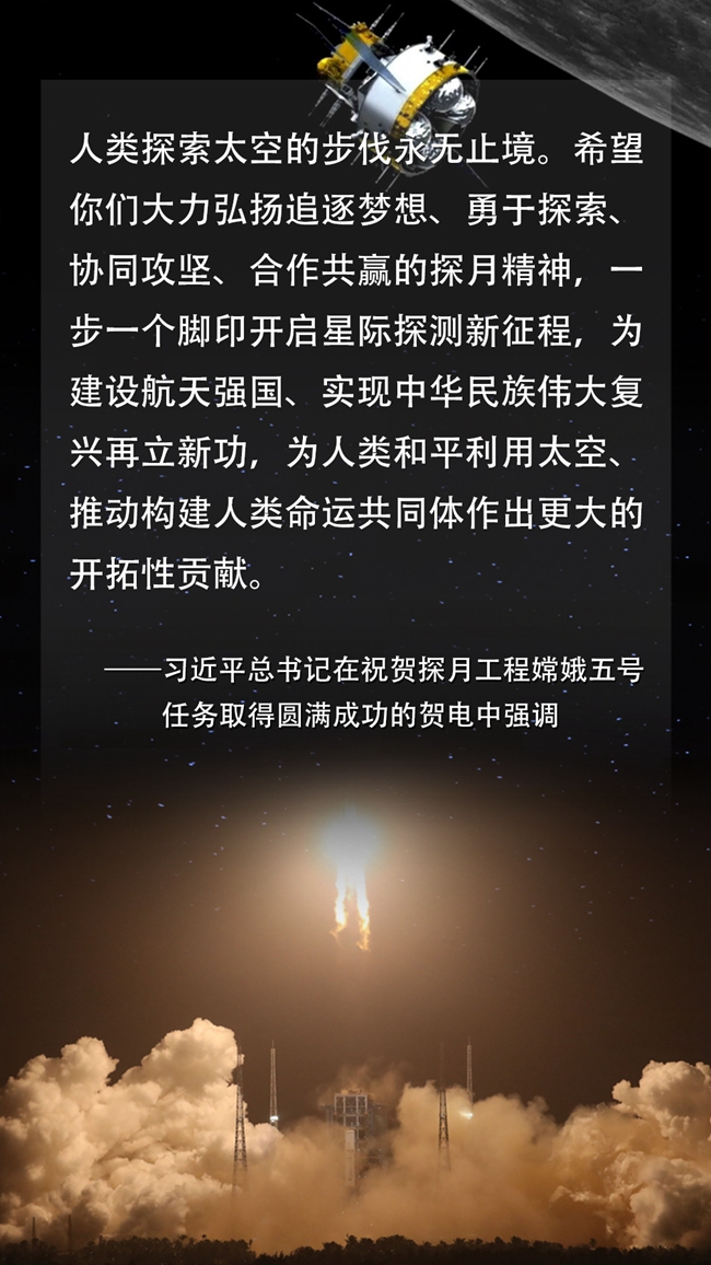攬?jiān)露鴼w,踏夢(mèng)而行。12月17日凌晨,嫦娥五號(hào)返回器攜帶月球樣品安全著陸。習(xí)近平總書(shū)記發(fā)來(lái)賀電,高度評(píng)價(jià)嫦娥五號(hào)任務(wù)取得圓滿成功的重大意義,深情寄語(yǔ)航天工作者大力弘揚(yáng)探月精神,開(kāi)啟星際探測(cè)新征程。