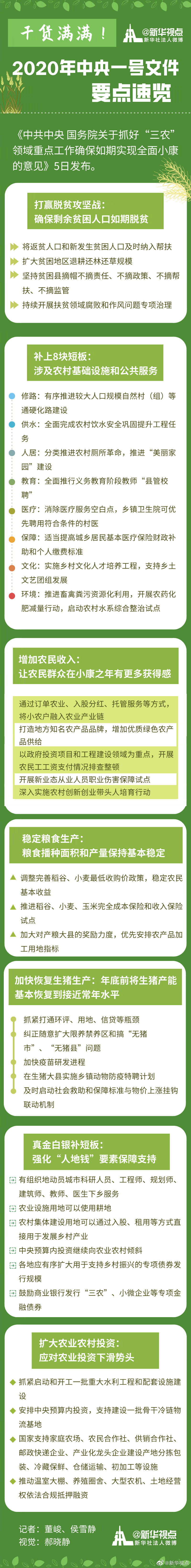 《中共中央 國(guó)務(wù)院關(guān)于抓好“三農(nóng)”領(lǐng)域重點(diǎn)工作確保如期實(shí)現(xiàn)全面小康的意見》5日發(fā)布。針對(duì)集中力量完成打贏脫貧攻堅(jiān)戰(zhàn)和補(bǔ)上全面小康“三農(nóng)”領(lǐng)域突出短板這兩大重點(diǎn)任務(wù),文件有哪些干貨、硬貨? ?