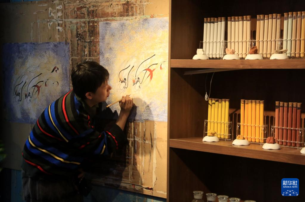 2月22日,在敦煌小镇鸣沙书院,来自甘肃的学员朱俊峰学习敦煌壁画临摹技艺。