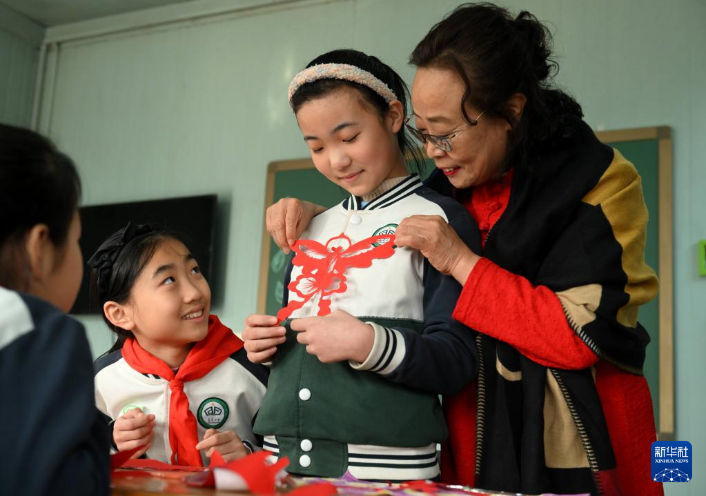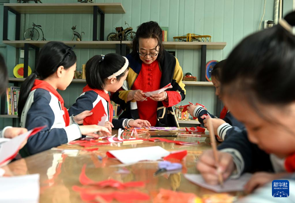 2月28日,国家级非遗蔚县剪纸代表性传承人周淑英(左三)在石家庄市东风小学非遗工坊给学生传授剪纸技艺。
