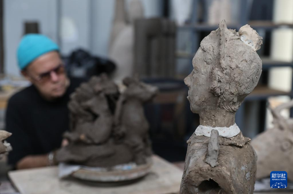 托尔斯滕·尤雷尔在江西景德镇陶溪川陶瓷文化创意园自己的工作室内创作(4月20日摄)。