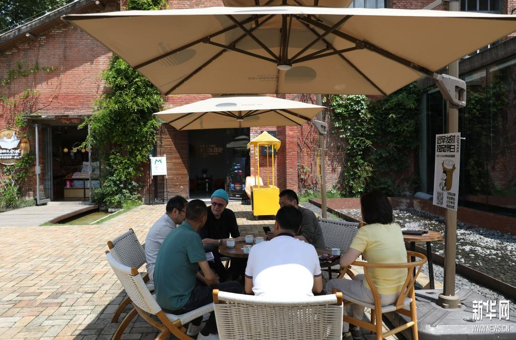 在江西景德镇陶溪川陶瓷文化创意园,托尔斯滕·尤雷尔(左三)与朋友们喝咖啡交谈(4月20日摄)。