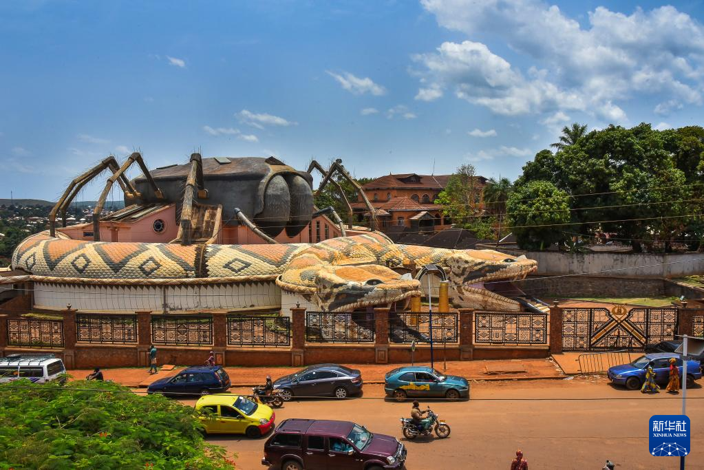 这是4月12日在喀麦隆西部大区丰班拍摄的根据巴蒙象征“双头蛇、蜘蛛和双锣”修建的新博物馆——巴蒙国王博物馆。
