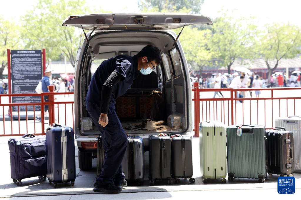6月30日,工作人员在故宫观众服务中心将游客寄存的行李装车,准备运往神武门出口。