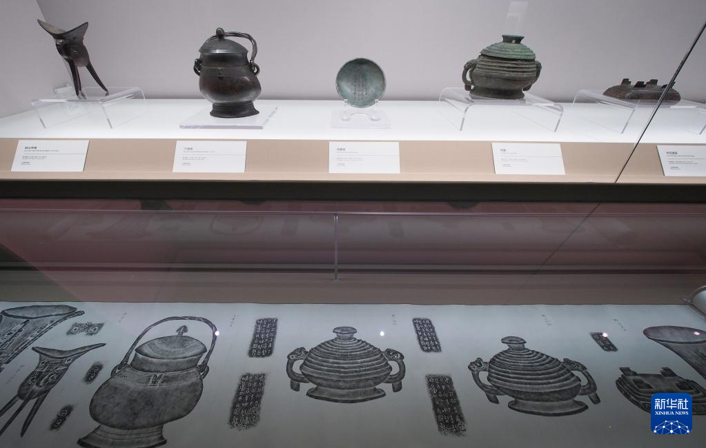 7月6日在上海博物馆展厅拍摄的晚清金石学家吴大澂《愙斋集古图》原器与墨拓对照(部分)。