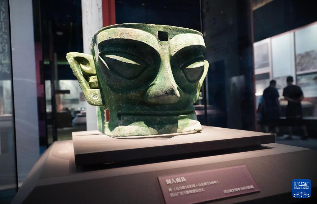 成果展上展出的四川省文物考古研究院藏四川广汉三星堆遗址出土铜人面具(7月12日摄)。