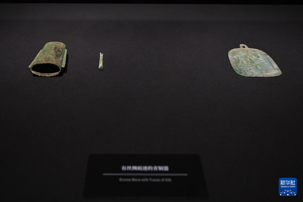 这是7月26日在三星堆博物馆新馆拍摄的有丝绸痕迹的青铜器。新华社记者 王曦 摄