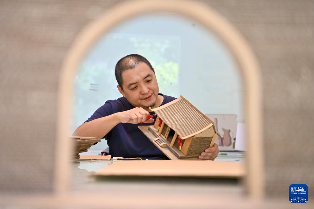 王帅栋在位于山西省太原市万柏林区的工作室内修整瓦楞纸作品(8月1日摄)。