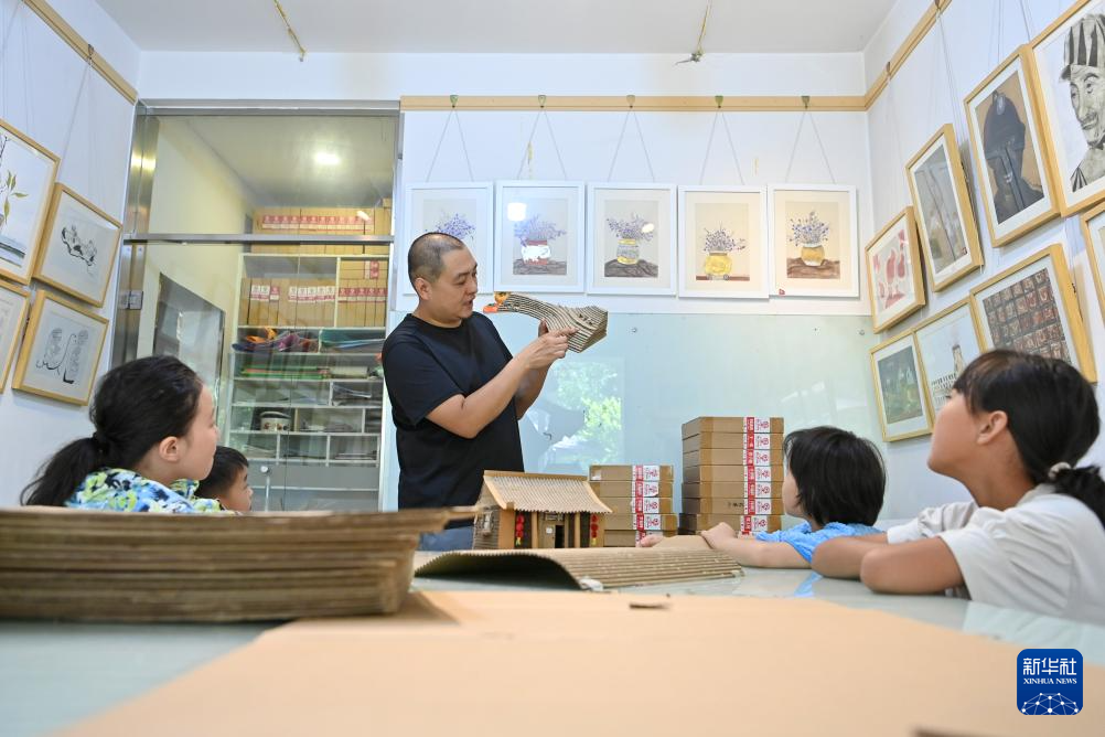在位于山西省太原市万柏林区的工作室内,王帅栋和小朋友们分享瓦楞纸作品背后的地理知识(8月4日摄)。