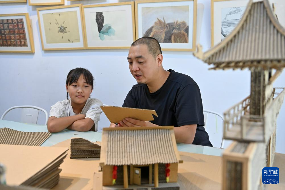 在位于山西省太原市万柏林区的工作室内,王帅栋向女儿传授瓦楞纸裁剪技巧(8月4日摄)。