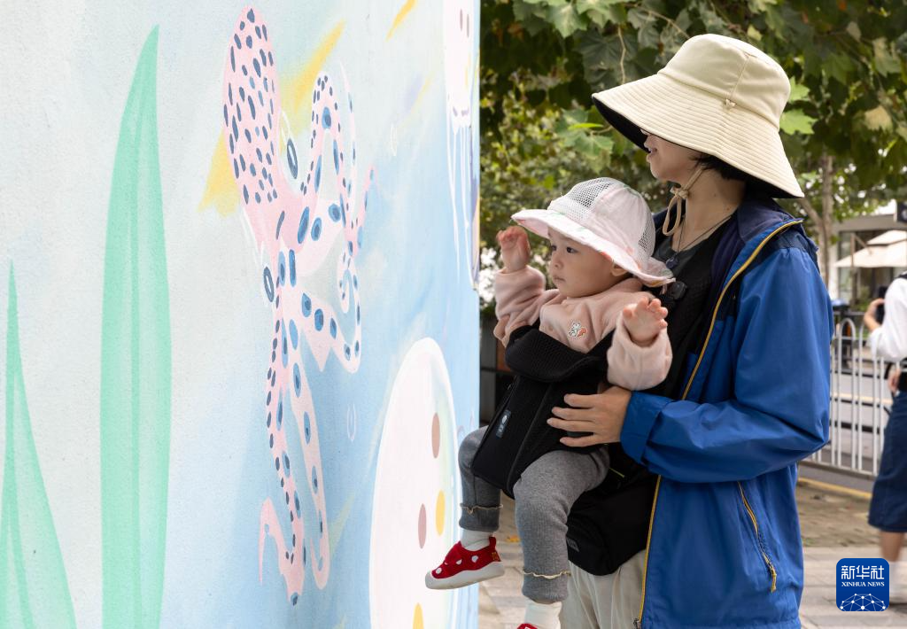 10月9日,市民带着小孩在上海光华创意街区一处涂鸦墙前驻足观看。